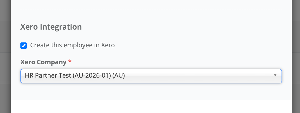 If more than one Xero company is linked, a dropdown will appear allowing you to select which payroll company the employee should be added to.